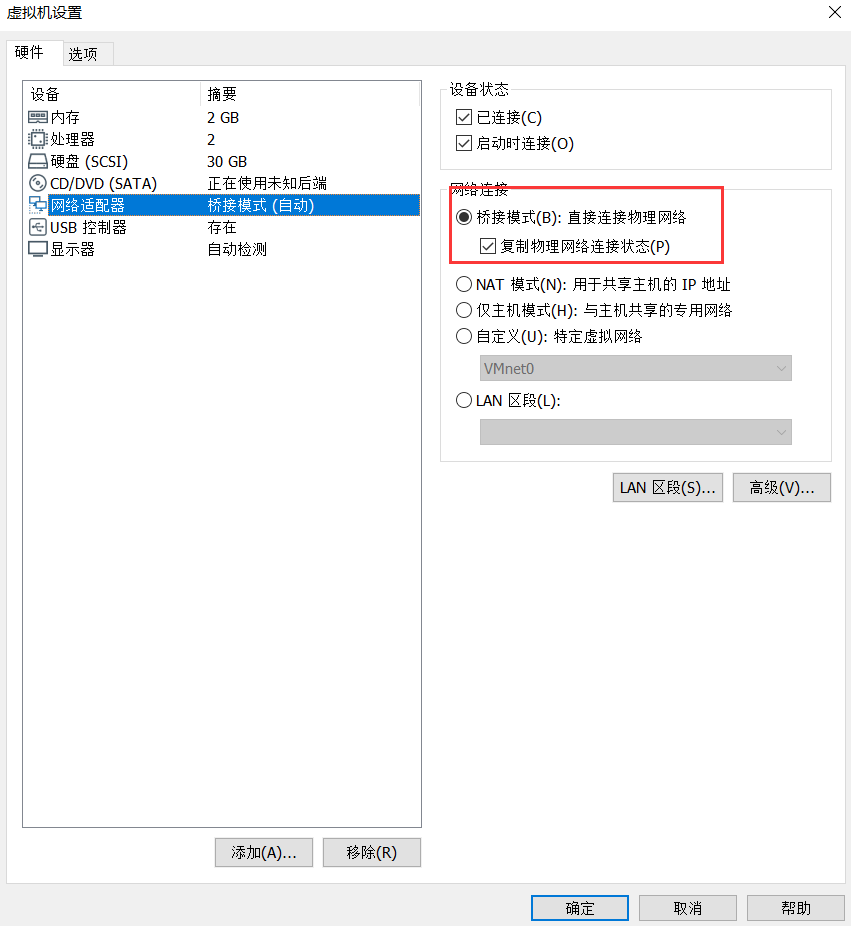 这里我设置网络连接为桥接模式: