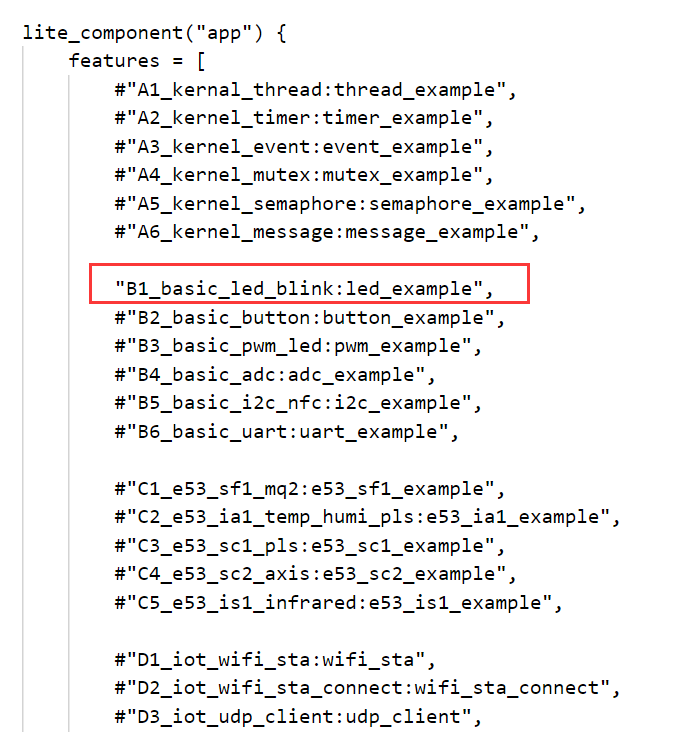 这些例程由applications/BearPi-HM_Nano/sample/目录下的BUILD.gn进行统一管理,这是个构建相关的文件,我们可以很方便地选中编译某个例程,比如编译led的demo: