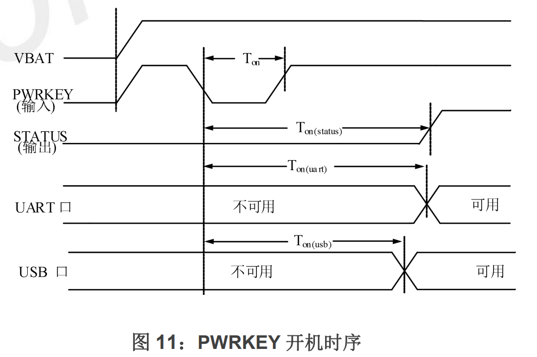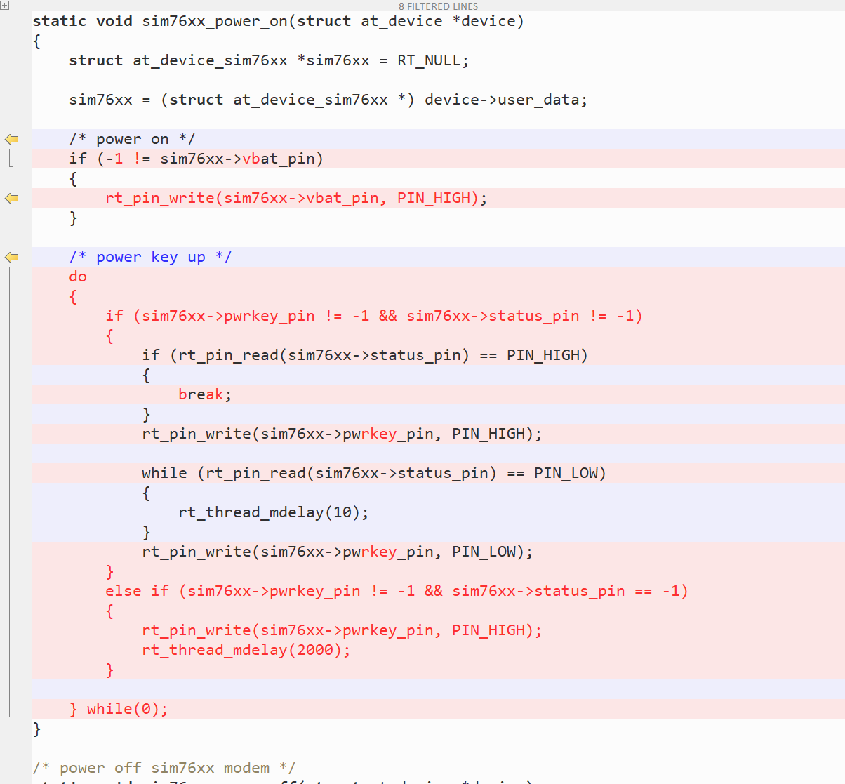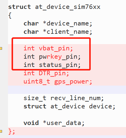 官方手册上这样定义上电时序,对于低功耗应用通常我们会控制VBAT,因此就是三个控制引脚。VBAT、PWRKEY、STATUS。因此我们修改struct at_device_sim76xx结构的控制引脚为三个,并修改上下此电时序以满足手册要求。