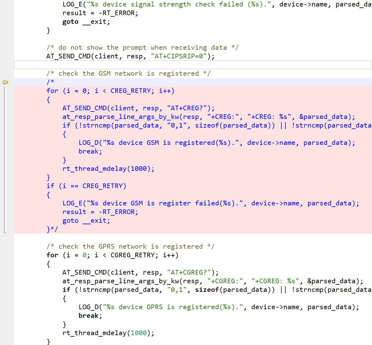 3、修改sim76xx_init_thread_entry注释掉AT+CREG?过程,直接使用AT+CGREG?检测网络状态,电信卡来说AT+CREG总是失败