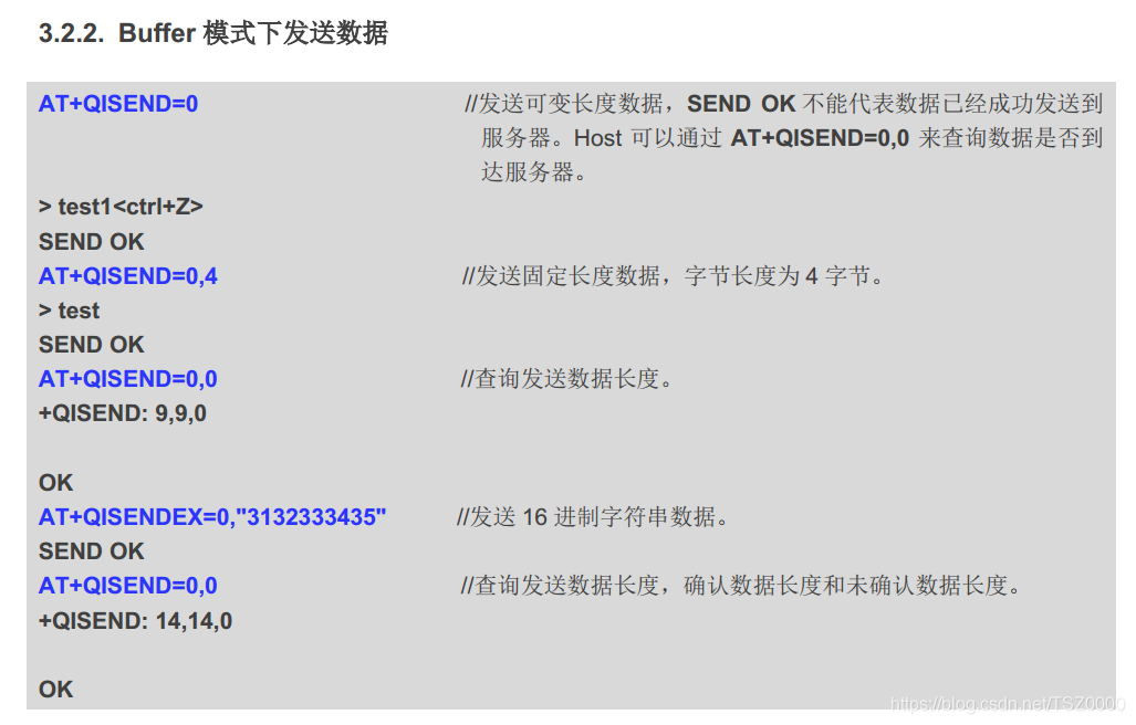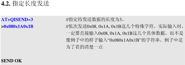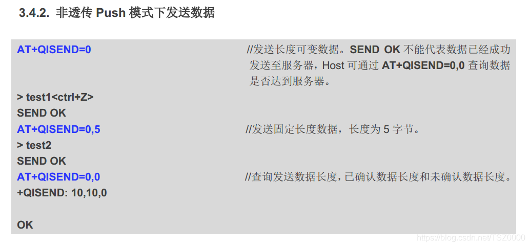 如果指定套接字服务的<access_mode>是缓冲区访问模式或直接推送模式,则数据可以是通过AT + QISEND发送。如果数据成功发送到模块,将返回“ SEND OK ” 。否则它将返回“ SEND FAIL ” 或“ ERROR ” 。“ SEND FAIL ” 表示发送缓冲区已满客户可以尝试重新发送数据。“ERROR”表示在发送过程中遇到错误 数据。客户应该延迟一段时间来发送数据。最大数据长度为1460字。“SEND OK”并不意味着数据已成功发送到服务器。客户可以查询数据是否通过AT + QISEND = ,0命令到达服务器。透传模式下不需要AT指令发送数据
