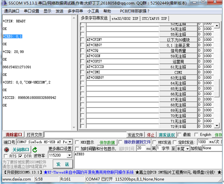 推荐使用sscom.exe,此工具可以预先保存一些常用的AT指令。如下图,发送AT+CREG指令,如果回复+CREG: 0,1则说明模块已经注册上运营商网络了。