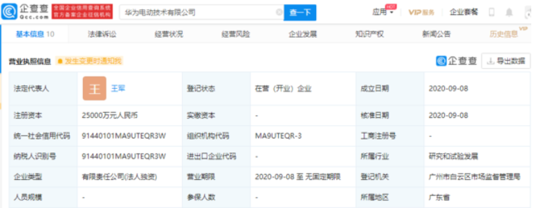 根据企查查消息显示,华为电动技术有限公司已经成立,注册资本 2.5 亿人民币,法定代表人为王军,由华为技术有限公司100%持股。