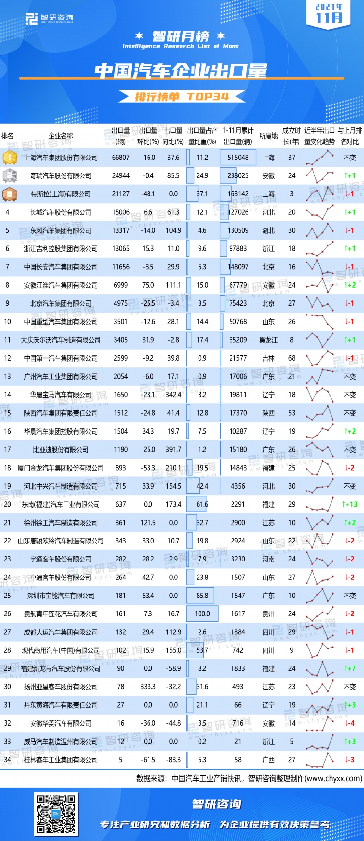 以上就是优雅手机最近收集整理的关于2021年11月中国汽车企业出口量排行榜:Top前十中仅top1排名不变,其他企业排名均呈现小幅度变化(附月榜TOP34详单)的全部内容,更多相关2021年11月中国汽车企业出口量排行榜:Top前十中仅top1排名不变内容请搜索靠谱客的其他文章。