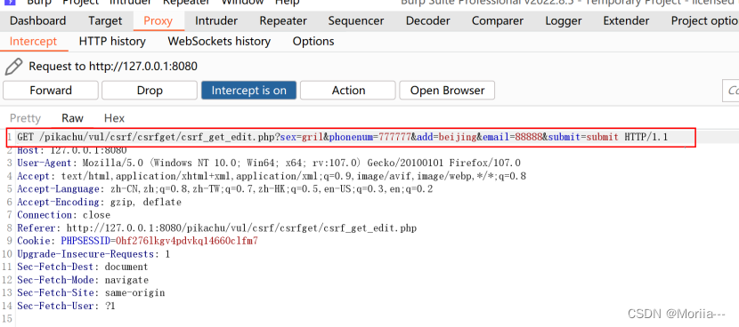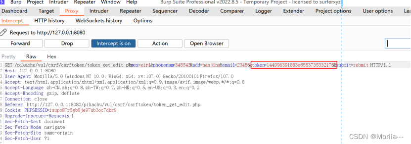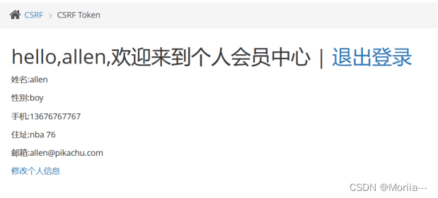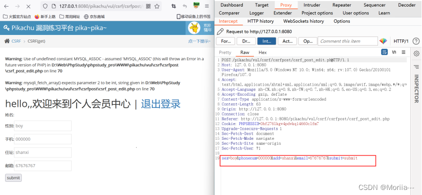 - 在pikachu中打开CSRF(Token),登录,修改个人信息,进行抓包