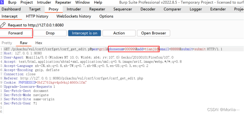 我们修改这条语句,地址修改为tianjin,手机号修改为000999,点击forward,intercept is off