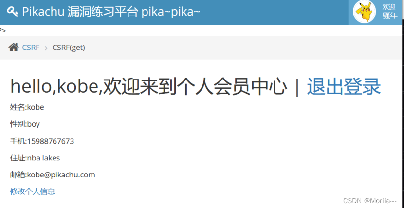 1)这里我们随便登录一个用户,假如登陆的是kobe,进去之后是如下页面,可以看见我们之前修改过的信息。
