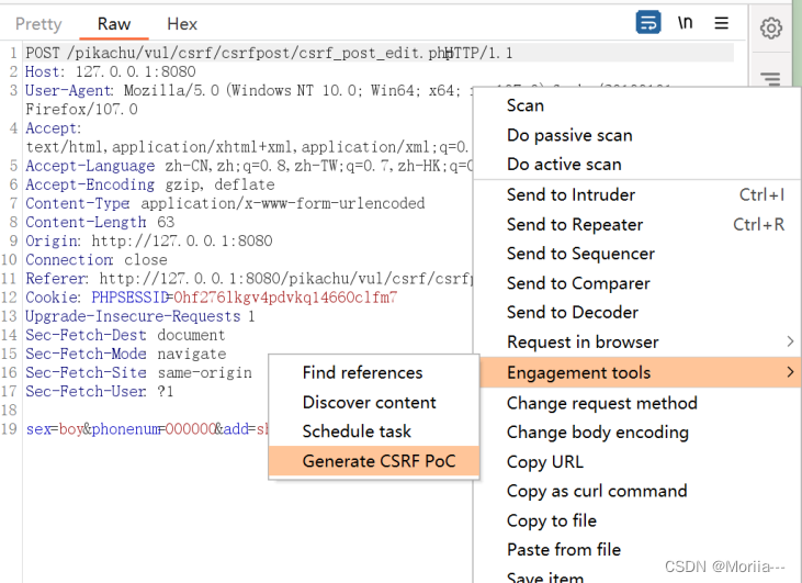 点击修改信息,抓一个包,我们看见参数在请求体里,需要制作一个表单的网站,诱导用户填写信息。