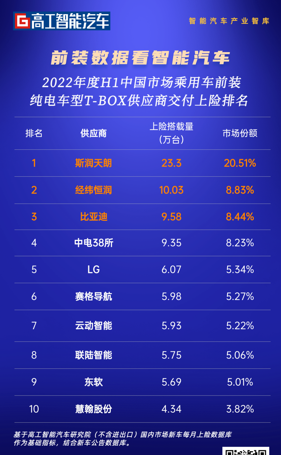 高工智能汽车研究院监测数据显示,2022年1-6月纯电动前装搭载T-BOX上险量前十供应商中,斯润天朗、经纬恒润、比亚迪排名前三位,前十供应商合计份额超过75%,但市场长尾效应也很明显,总计有超过50家供应商在纯电动乘用车细分市场有前装供应。