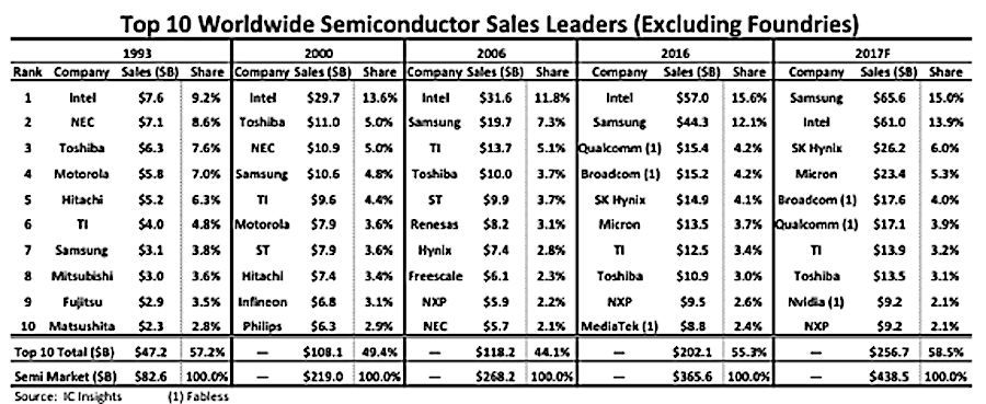在全球市场上,排名前10的芯片供应商如下:
