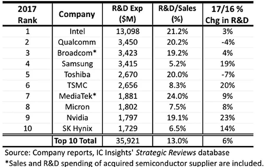 芯片代工制造虽然如此,但是从芯片供应商的收入和研发投入来看,中国芯片供应商与全球的差距还是很大。