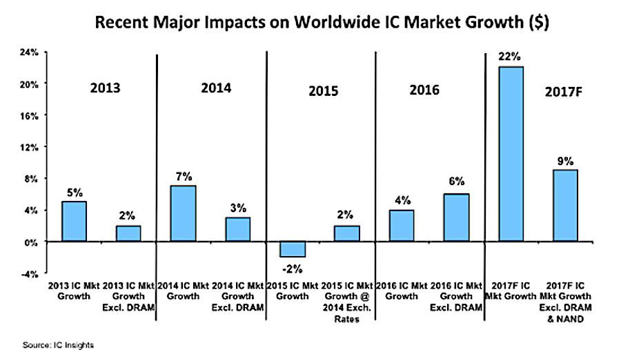 在对720亿美元的DRAM市场预计中,在2017半导体行业这是迄今为止最大收入规模的单一产品类别,超过预期的NAND闪存市场498亿美元。DRAM和NAND闪存细分市场预计将对2017年IC芯片市场整体增长13个百分点产生积极的影响。除这些内存部分外,IC行业预计增长9%,包括这些内存市场在内也不到目前占总IC市场增长率22%的一半。