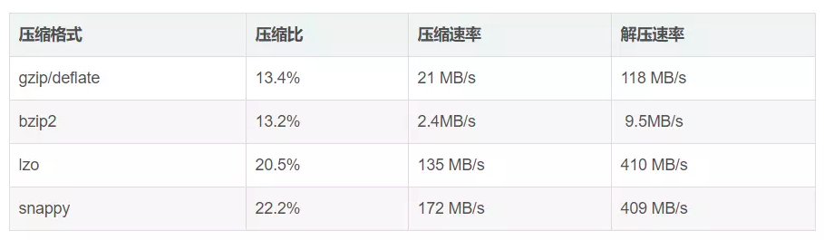 不同的场景选择不同的压缩方式,肯定没有一个一劳永逸的方法,如果选择高压缩比,那么对于cpu的性能要求要高,同时压缩、解压时间耗费也多;选择压缩比低的,对于磁盘io、网络io的时间要多,空间占据要多;对于支持分割的,可以实现并行处理。