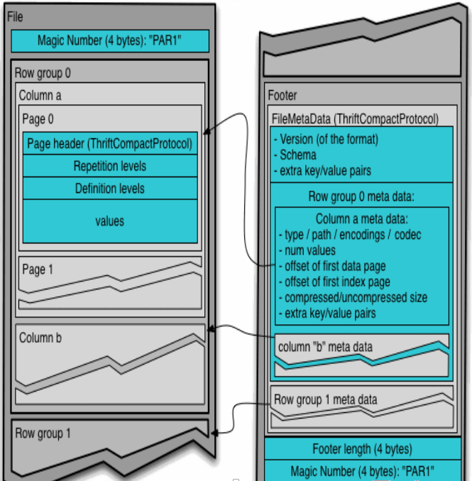 通常情况下,在存储Parquet数据的时候会按照Block大小设置行组的大小,由于一般情况下每一个Mapper任务处理数据的最小单位是一个Block,这样可以把每一个行组由一个Mapper任务处理,增大任务执行并行度。Parquet文件的格式如下图所示。