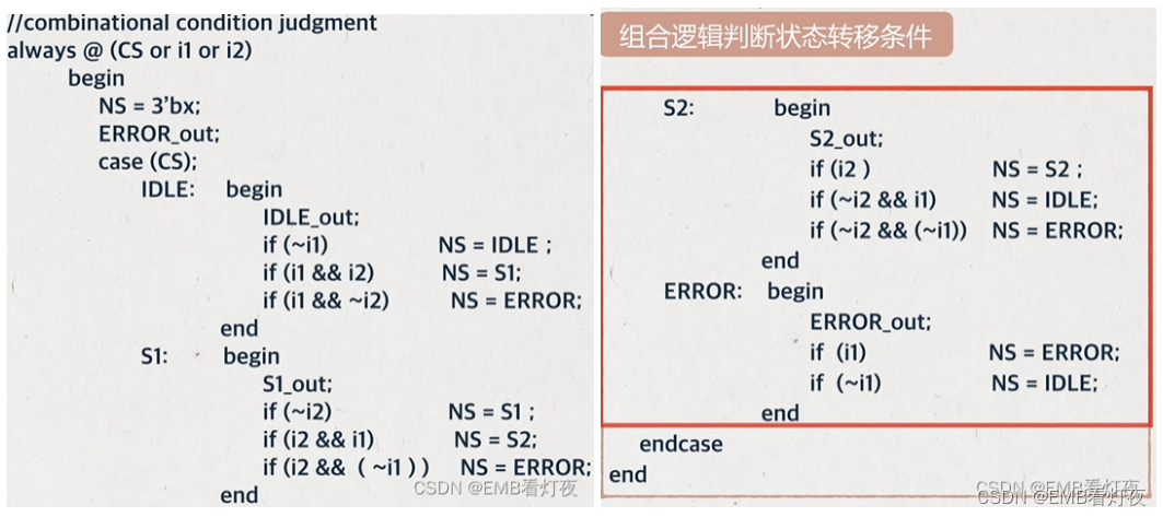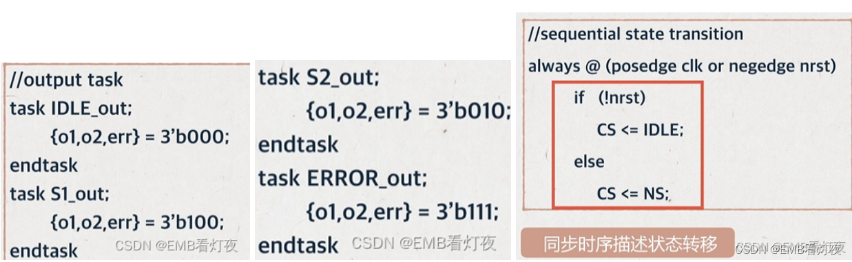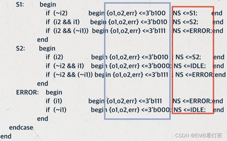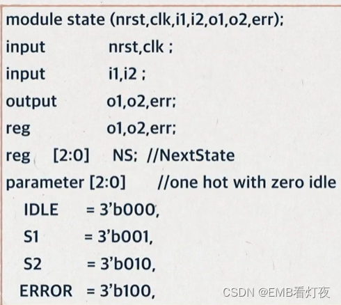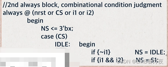 *新二段式:分两段描写状态机。第一段使用时序逻辑描述状态的转移和 状态转移条件,第二段同样使用时序逻辑描述状态的输出。这种形式可以直接根据转台转移图写出,并且几乎所有的综合器都能识别它是状态机,因此本例使用这种结构编写。
