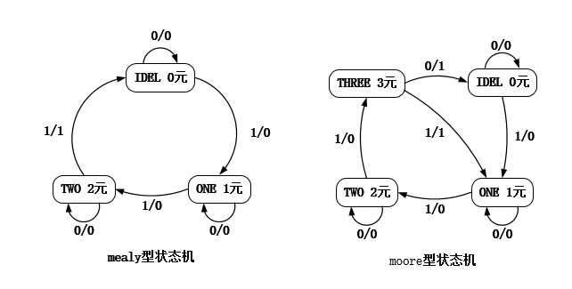状态机选择:对于本题,由于mealy型状态机(左)比moore型状态机(右)需要的状态更少,代码编写更加方便,因此我们选择mealy型状态机。