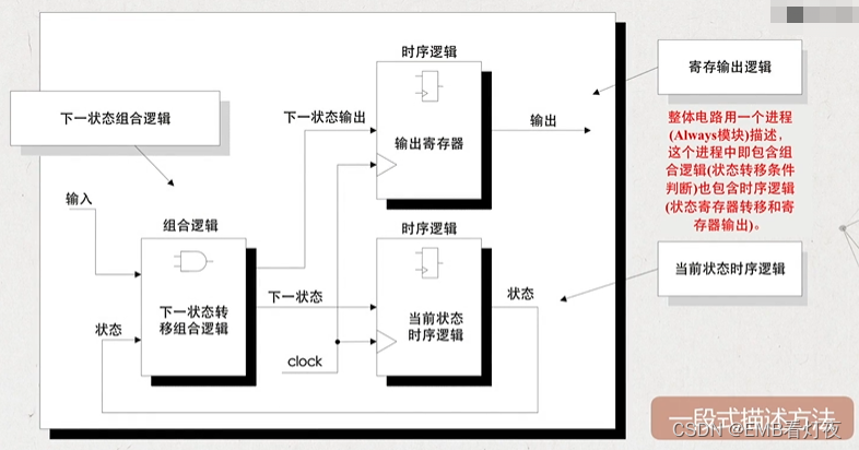 *一段式: 在一段代码中使用时序逻辑描述全部的输入条件、状态同步转移,状态输出。可是这种形式不能描述较为复杂或者大型的状态机。(缺点太多,避免使用)