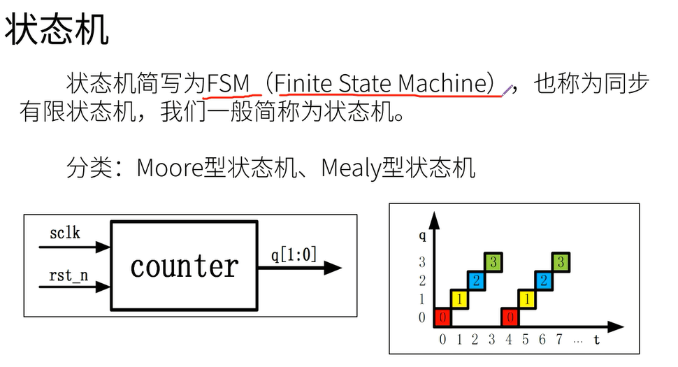不同的:在输出时,若最后的输出只和当前状态有关而与输入无关则是moore(木耳)状态机。若最后的输出不仅当前状态有关还与输入也有关则是mealy(米丽)状态机。
