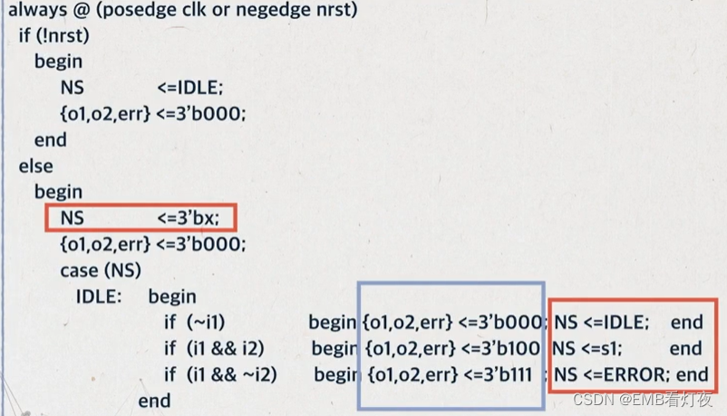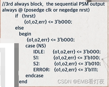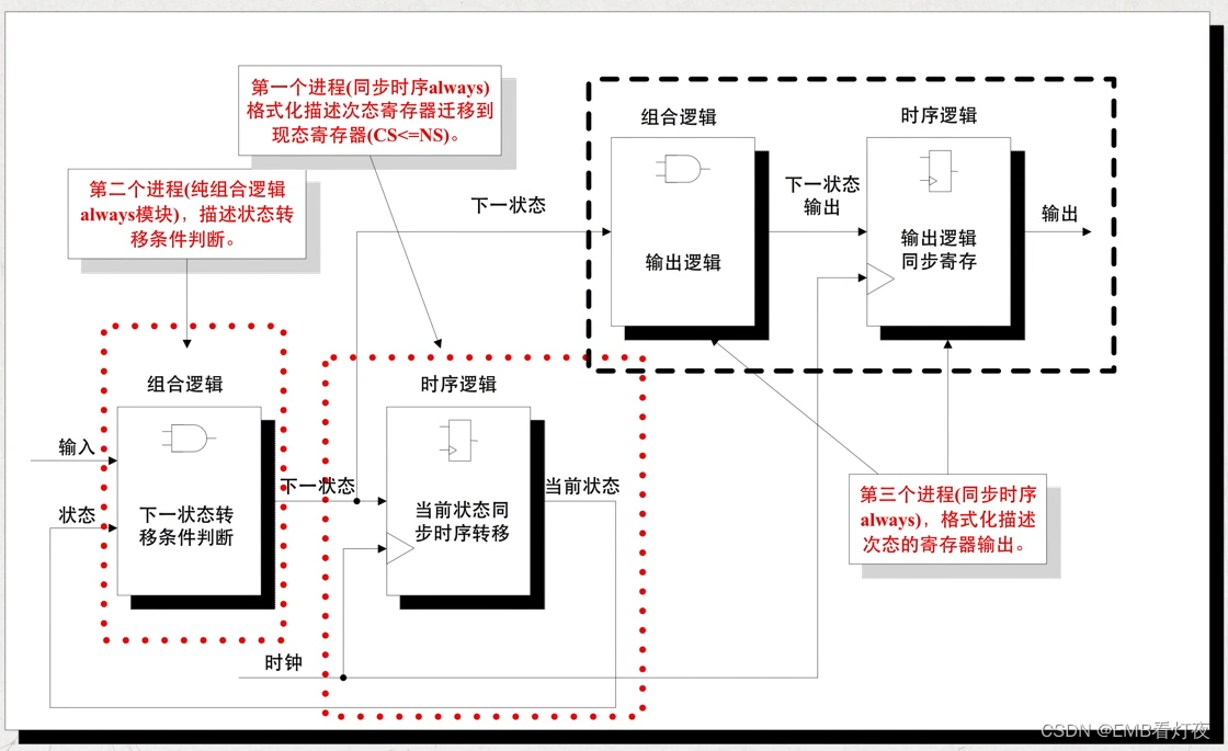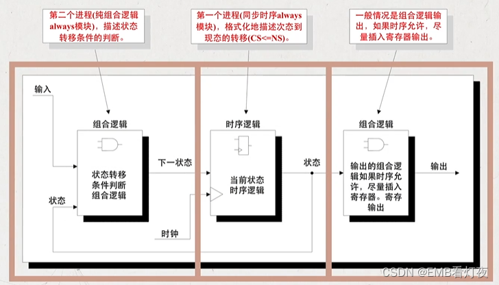 *三段式:分三段描写状态机。(用于解决再不允许多一个时钟延时的情况下,相对于二段式状态机输出出现毛刺的情况,使用时序逻辑输出实现信号稳定)