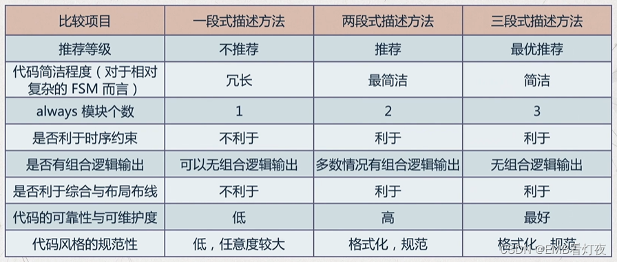 上述三种方法是老的方法,编写时必须按照严格的格式进行编写,综合器才能识别其为状态机并生成电路。下面我们对上述三种结构进行总结。