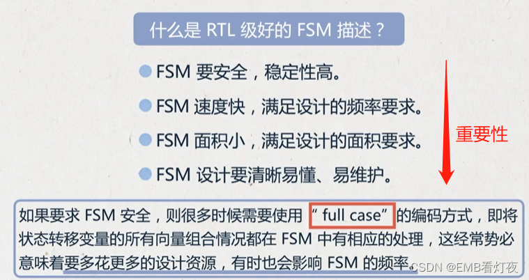 优点:使FSM状态机做到了同步寄存器输出。消除了组合逻辑输出的不稳定与毛刺的隐患。更利于时序路径分组。在 FPGA/CPLD等可编程逻辑器件上的综合与布局布线效果更佳。