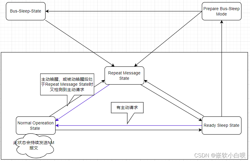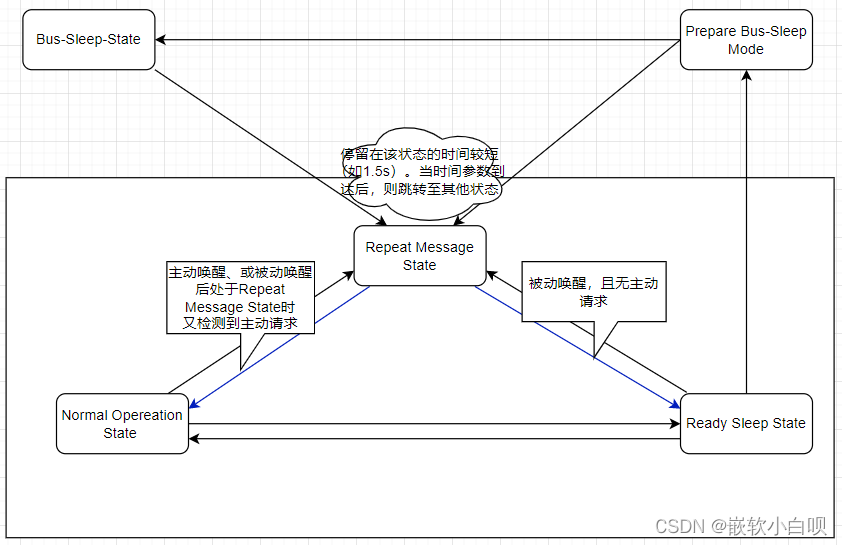 或②当ECU被动唤醒且在Repeat Message State检测到主动请求,则当Repeat Message State的时间参数满足后,状态跳转至Normal Opearation State