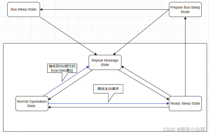 (跳转条件与Normal Operation State跳到Repeat Message State一样)根据Autosar的CAN网络管理标准,当CANNM处于Normal Opearation State或Ready Sleep State时接收到总线上CANNM报文的Byte1的Bit0置1时,需要把状态跳转至Repeat Message State。这个功能的作用实际上是用来检测总线上还有哪些ECU节点在线,因为如前面所说,处于Repeat Message State时需要发出CANNM报文。
