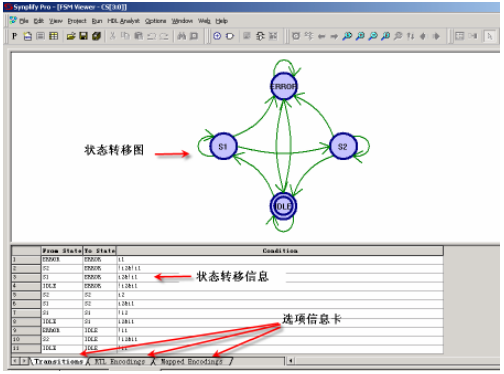 FSM Viewer 的主界面主要由状态转移图和 FSM 信息显示选项卡组成。状态转移图是源代码经过编译再现的状态机。FSM 信息显示包含转移条件(Transitions)、寄存器传输级状态编码(RTL Encodings)和映射后状态编码(Mapped Encodings)等 3 个选项卡,如图 1-8 所示。