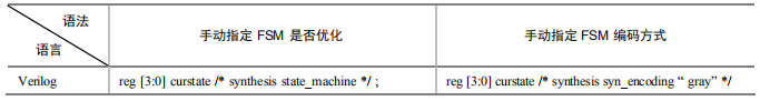 在代码中添加综合器的综合约束属性或者在图形界面下设置综合约束属性可以比较方便地改变状态的编码。需要注意的是:Synplicity、Synopsys、Exemplar 等综合工具关于 FSM 的综合约束属性的语法格式各不相同。