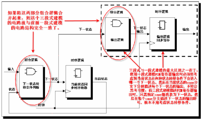 从代码上看,三段式建模的前两段与两段式建模完全相同,仅仅多了一段寄存器 FSM 输出。一般来说,使用寄存器输出可以改善输出的时序条件,还能避免组合电路的毛刺,所以是更为推荐的描述方式。但是电路设计不是一成不变的,在某些情况下,两段式结构比三段式结构更有优势。请大家再分析一下图1-5、图 1-6 的结构,细心的读者会发现,两段式用状态寄存器分割了两部分组合逻辑(状态转移条件组合逻辑和输出组合逻辑);而三段式结构中,从输入到寄存器状态输出的路径上,要经过两部分组合逻辑(状态转移条件组合逻辑和输出组合逻辑),从时序上,这两部分组合逻辑完全可以看为一体。这样这条路径的组合逻辑就比较繁杂,该路径的时序相对紧张。也就是说,两段式建模中用状态寄存器分割了组合逻辑,而三段式将寄存器移到组合逻辑的最后端。如果寄存器前的组合逻辑过于复杂,势必会成为整个设计的关键路径,此时就不宜再使用三段式建模,而要使用两段式建模。解决两段式建模组合逻辑输出产生毛刺的方法是,额外的在 FSM 后级电路插入寄存器,调整时序,完成功能。