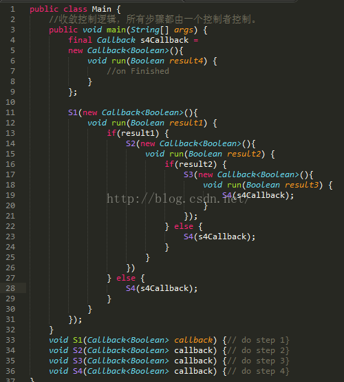 为了便于表达, 这里我把每个步骤增加一个返回值,作为是否跳转依据, 修改后的模型代码如下(Callback<Boolean>即返回Boolean类型的异步回调):