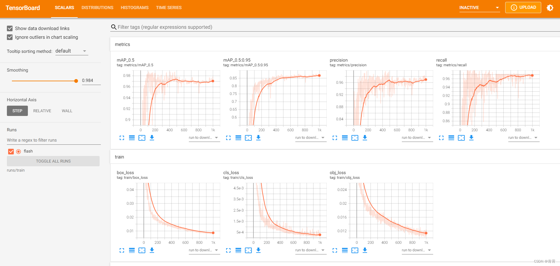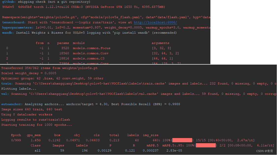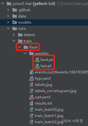 会在主目录下产生一个run文件夹,在run/train/flash/weights/目录下会产生两个权重文件,一个是最后一轮的权重文件last.pt,一个是最好的权重文件best.pt。