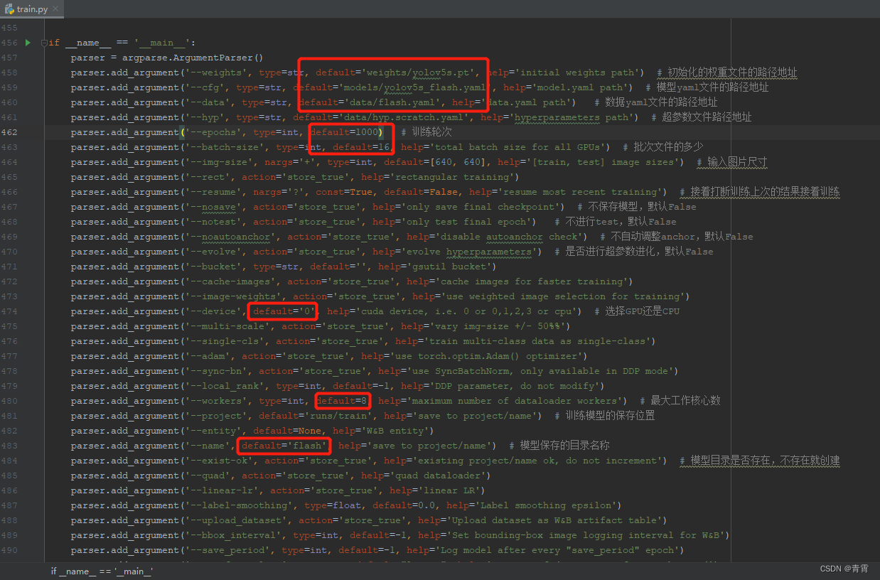 修改train.py文件,主要修改weights权重路径、models模型路径、数据配置文件路径、轮询次数、是否使用GPU、模型保存位置