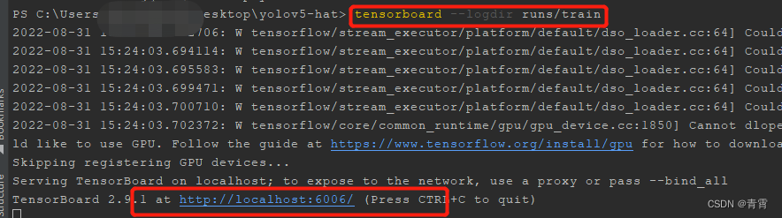打开pycharm的terminal,输入“tensorboard --logdir=runs/train”:
