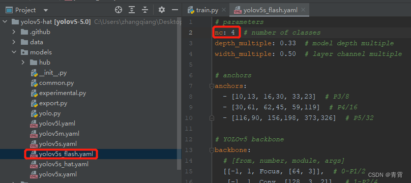 由于该项目使用的是yolov5s.pt这个预训练权重,所以要使用models目录下的yolov5s.yaml文件中的相应参数(因为不同的预训练权重对应着不同的网络层数,所以用错预训练权重会报错)。同上修改data目录下的yaml文件一样,将yolov5s.yaml文件复制一份,然后将其重命名为
