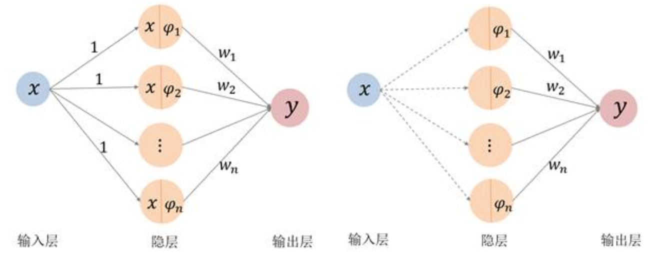 (从这里我们将基函数称为“激活函数”)。输入层到隐层的权设为常值1(左图),也可以看成为将输入层的值“直接代入”到激活函数(右图)。隐层到输出层的权为基函数的组合系数