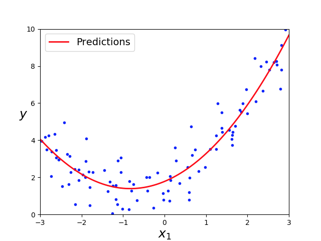 # -*- coding: utf-8 -*- import matplotlib.pyplot as plt import numpy as np from sklearn.preprocessing import PolynomialFeatures from sklearn.linear_model import LinearRegression if __name__ == '__main__': # generate a random dataset np.random.seed(42) m = 100 X = 6 * np.random.rand(m, 1) - 3 y = 0.5 * X ** 2 + X + 2 + np.random.randn(m, 1) plt.plot(X, y, "b.") plt.xlabel("$x_1$", fontsize=18) plt.ylabel("$y$", rotation=0, fontsize=18) plt.axis([-3, 3, 0, 10]) plt.show() # use Scikit-Learn PolynomialFeature class to constructing parameter terms. # a,b,degree=2: [a, b, a^2, ab, b^2] # a,b,degree=3: [a, b, a^2, ab, b^2, a^3, a^2b, ab^2, b^3] # a,b,c,degree=3: [a, b, c, a^2, ab, ac, b^2, bc, c^2, a^3, a^2b, a^2c, ab^2, ac^2, abc, b^3, b^2c, bc^2, c^3] poly_features = PolynomialFeatures(degree=2, include_bias=False) # fit the dataset with Polynomial Regression Function, and X_poly is the fitting X result X_poly = poly_features.fit_transform(X) print "X: ", X print "X_poly: ", X_poly lin_reg = LinearRegression() lin_reg.fit(X_poly, y) print(lin_reg.intercept_, lin_reg.coef_) # draw the prediction curve X_new = np.linspace(-3, 3, 100).reshape(100, 1) # fit the X_new dataset with Polynomial Regression Function, and X_new_poly is the fitting X result X_new_poly = poly_features.transform(X_new) y_new = lin_reg.predict(X_new_poly) plt.plot(X, y, "b.") plt.plot(X_new, y_new, "r-", linewidth=2, label="Predictions") plt.xlabel("$x_1$", fontsize=18) plt.ylabel("$y$", rotation=0, fontsize=18) plt.legend(loc="upper left", fontsize=14) plt.axis([-3, 3, 0, 10]) plt.show()