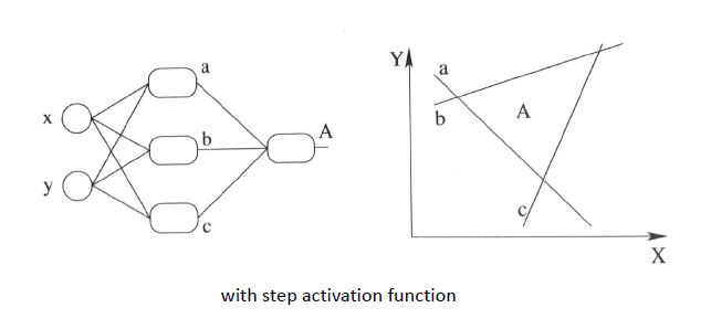我们知道,使用阶跃激活函数的多元感知机神经网络,本质上是多个线性分界面的组合,如下图: