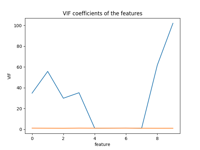 可以看到,0、1、2、3、8、9个特征的VIF都过高,其中第9个是我们人工构造出了存在线性相关依赖的新特征变量。
