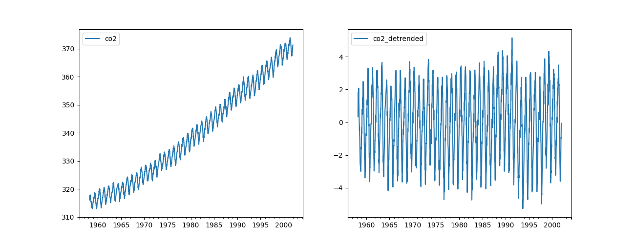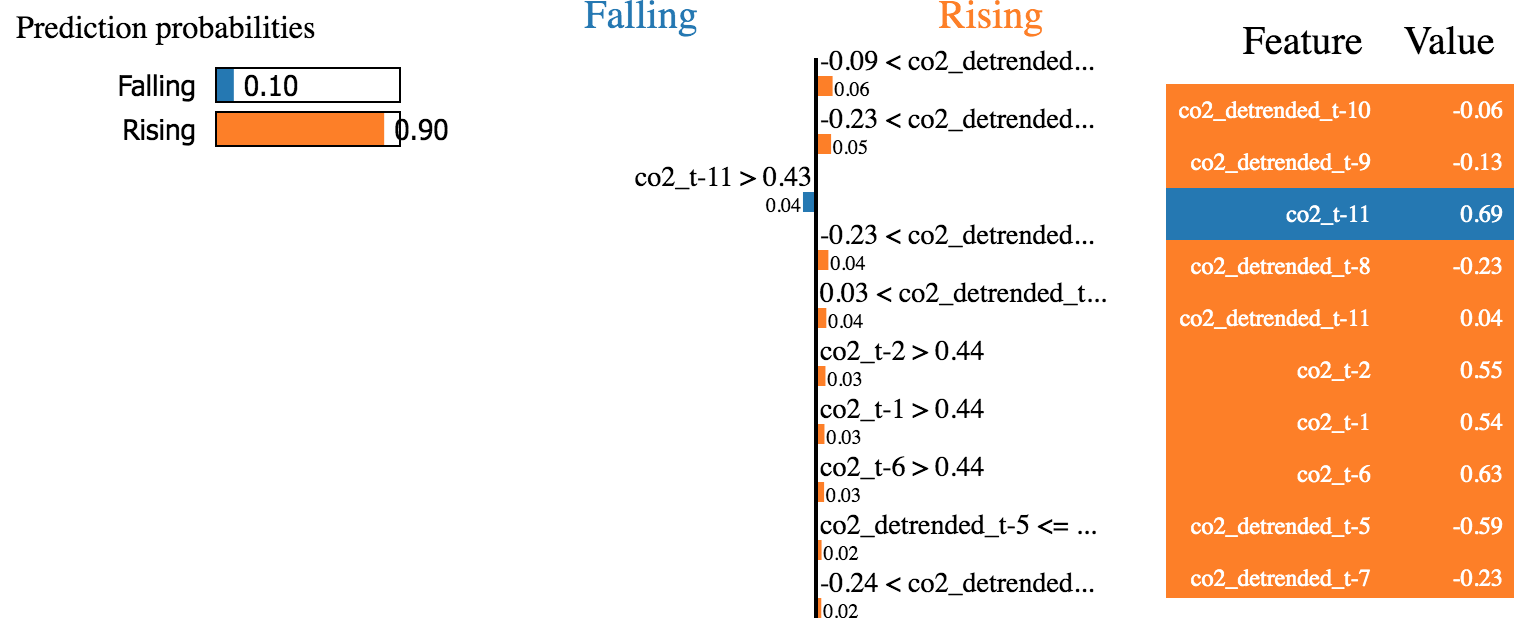 We can see that the most important features are the de-trended CO2 concentration several timesteps in the past. In particular, we see that if that feature is low in the recent past, then the concentration is now probably rising.