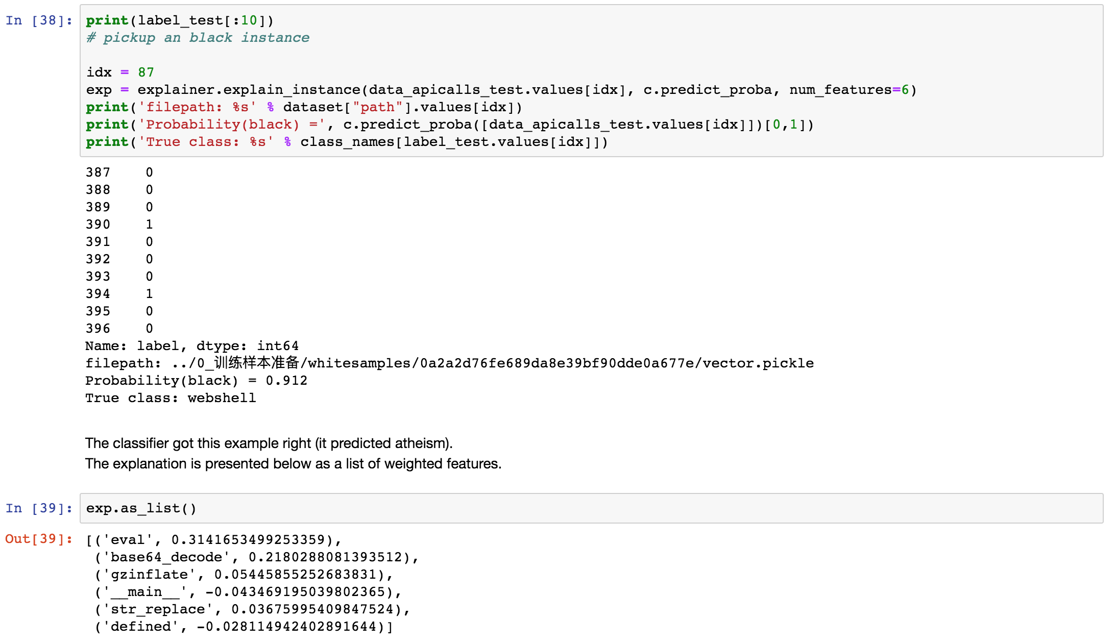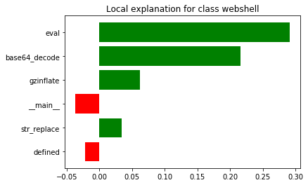 可以看到,对于这个判黑样本来说,主要是'eval'、'base64_decode'、'gzinflate'这些关键词起到了似然概率贡献作用,这也和我们的安全领域先验知识是吻合的。