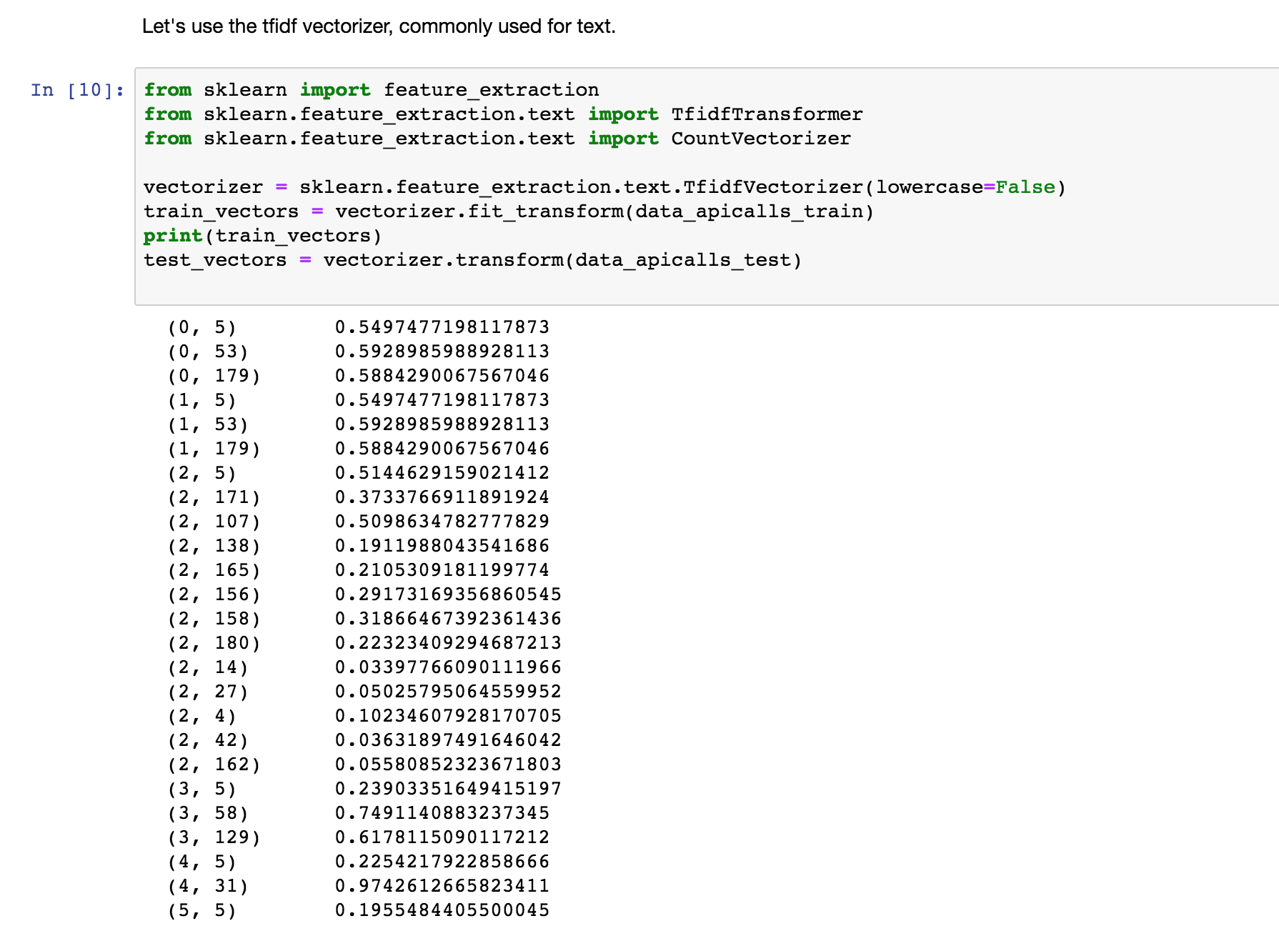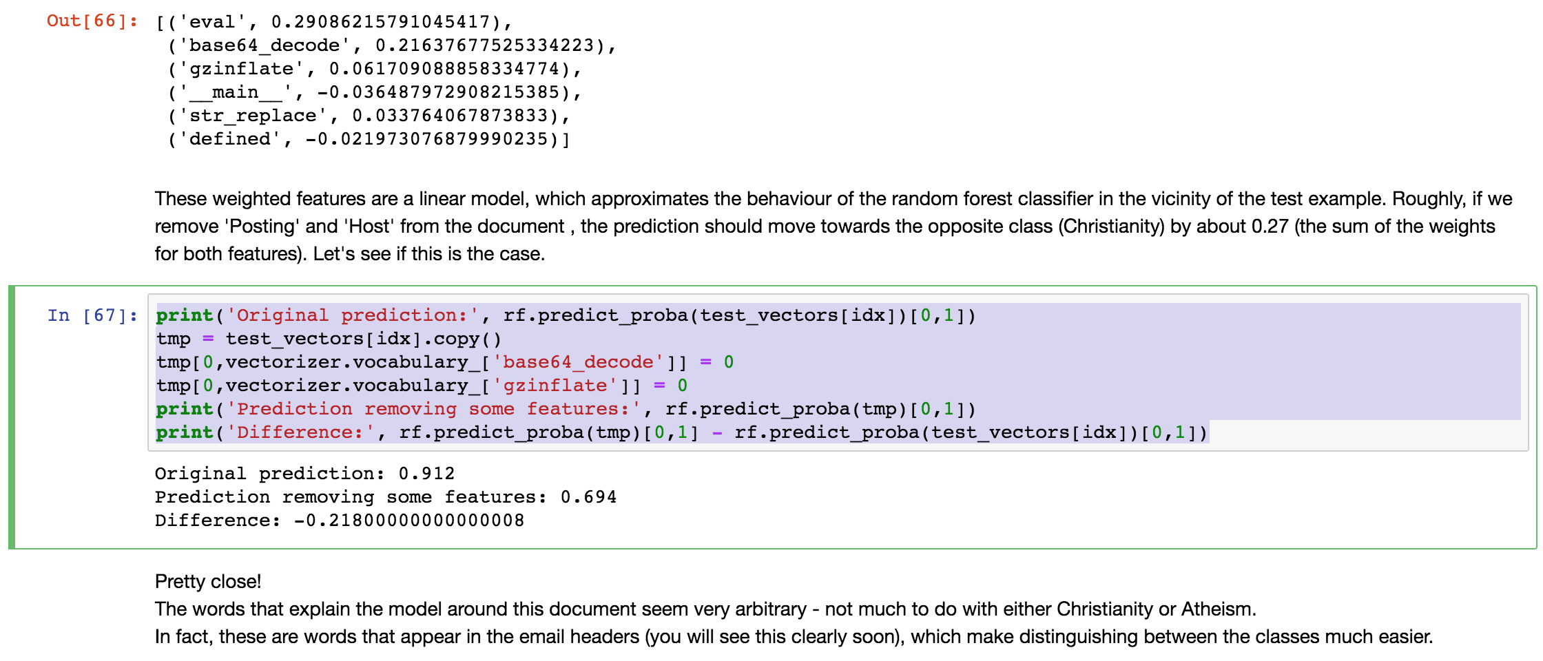 # -*- coding: utf-8 -*- import lime import sklearn import numpy as np import sklearn import sklearn.ensemble import sklearn.metrics from sklearn.datasets import fetch_20newsgroups from lime import lime_text from sklearn.pipeline import make_pipeline from lime.lime_text import LimeTextExplainer if __name__ == '__main__': # we'll be using the 20 newsgroups dataset. # In particular, for simplicity, we'll use a 2-class subset: atheism and christianity. categories = ['alt.atheism', 'soc.religion.christian'] newsgroups_train = fetch_20newsgroups(subset='train', categories=categories) newsgroups_test = fetch_20newsgroups(subset='test', categories=categories) class_names = ['atheism', 'christian'] # use the tfidf vectorizer, commonly used for text. vectorizer = sklearn.feature_extraction.text.TfidfVectorizer(lowercase=False) train_vectors = vectorizer.fit_transform(newsgroups_train.data) test_vectors = vectorizer.transform(newsgroups_test.data) # use random forests for classification. # It's usually hard to understand what random forests are doing, especially with many trees. rf = sklearn.ensemble.RandomForestClassifier(n_estimators=500) rf.fit(train_vectors, newsgroups_train.target) pred = rf.predict(test_vectors) print sklearn.metrics.f1_score(newsgroups_test.target, pred, average='binary') # Lime explainers assume that classifiers act on raw text, # but sklearn classifiers act on vectorized representation of texts. # For this purpose, we use sklearn's pipeline, and implements predict_proba on raw_text lists. c = make_pipeline(vectorizer, rf) print(c.predict_proba([newsgroups_test.data[0]])) # Now we create an explainer object. We pass the class_names a an argument for prettier display. explainer = LimeTextExplainer(class_names=class_names) # We then generate an explanation with at most 6 features for an arbitrary document in the test set. idx = 83 exp = explainer.explain_instance(newsgroups_test.data[idx], c.predict_proba, num_features=6) print('Document id: %d' % idx) print('Probability(christian) =', c.predict_proba([newsgroups_test.data[idx]])[0, 1]) print('True class: %s' % class_names[newsgroups_test.target[idx]]) # The classifier got this example right (it predicted atheism). # The explanation is presented below as a list of weighted features. print "exp.as_list(): ", exp.as_list() # These weighted features are a linear model, # which approximates the behaviour of the random forest classifier in the vicinity of the test example. # Roughly, if we remove 'Posting' and 'Host' from the document , # the prediction should move towards the opposite class (Christianity) by about 0.27 (the sum of the weights for both features). # Let's see if this is the case. print('Original prediction:', rf.predict_proba(test_vectors[idx])[0, 1]) tmp = test_vectors[idx].copy() tmp[0, vectorizer.vocabulary_['Posting']] = 0 tmp[0, vectorizer.vocabulary_['Host']] = 0 print('Prediction removing some features:', rf.predict_proba(tmp)[0, 1]) print('Difference:', rf.predict_proba(tmp)[0, 1] - rf.predict_proba(test_vectors[idx])[0, 1]) # Visualizing explanations # The explanations can be returned as a matplotlib barplot: fig = exp.as_pyplot_figure() fig.show() exp.save_to_file('./oi.html')
