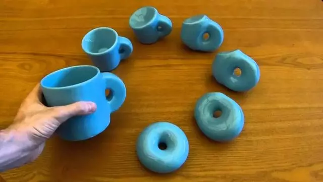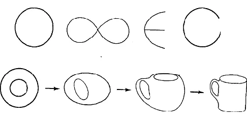 换句话说,拓扑学中,我们追求的是最本质的特征,比如一个流形有几个“孔”,这涉及到连通性的概念;再比如下图,对于拓扑学家来说,这里出现的所有实体,都是同一样事物(为什么?)