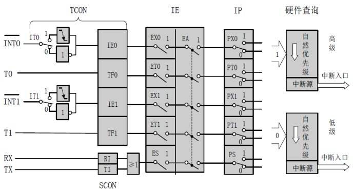 下面一图将充分说明51单片机的中断系统结构:
