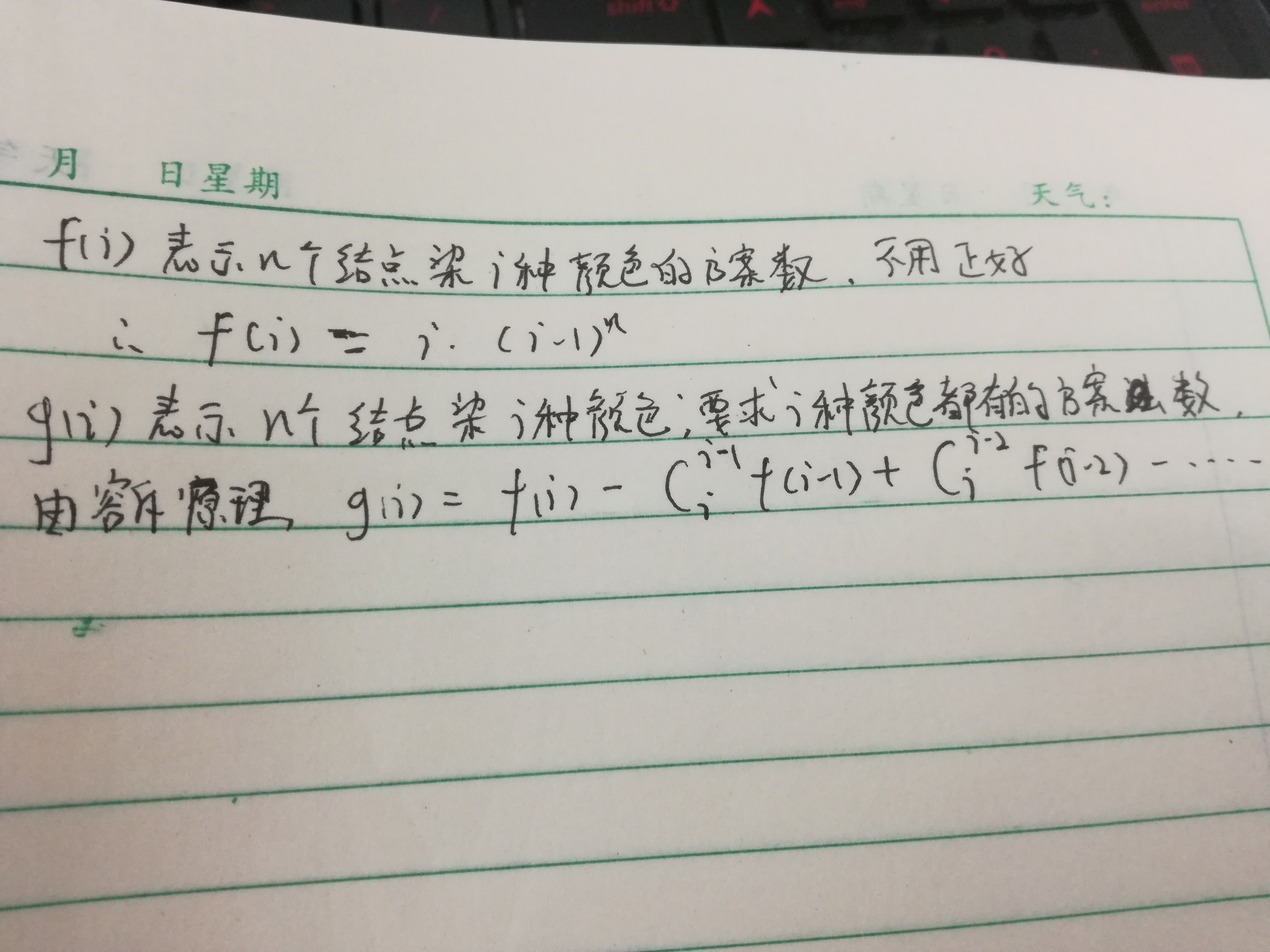 使用容斥原理,直接用k种不同颜色染色,结果为f(k)=k*(k-1)^(n-1)