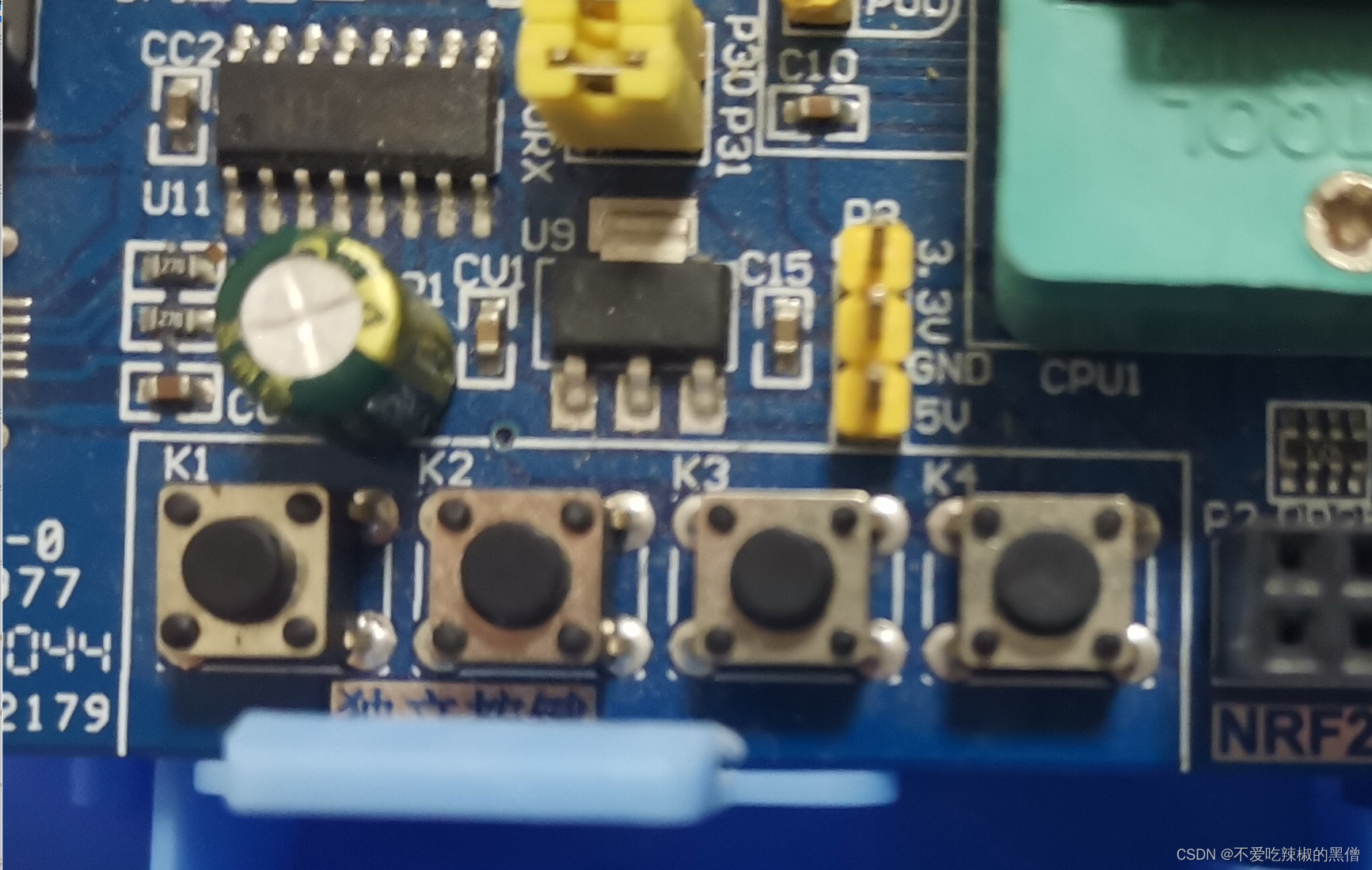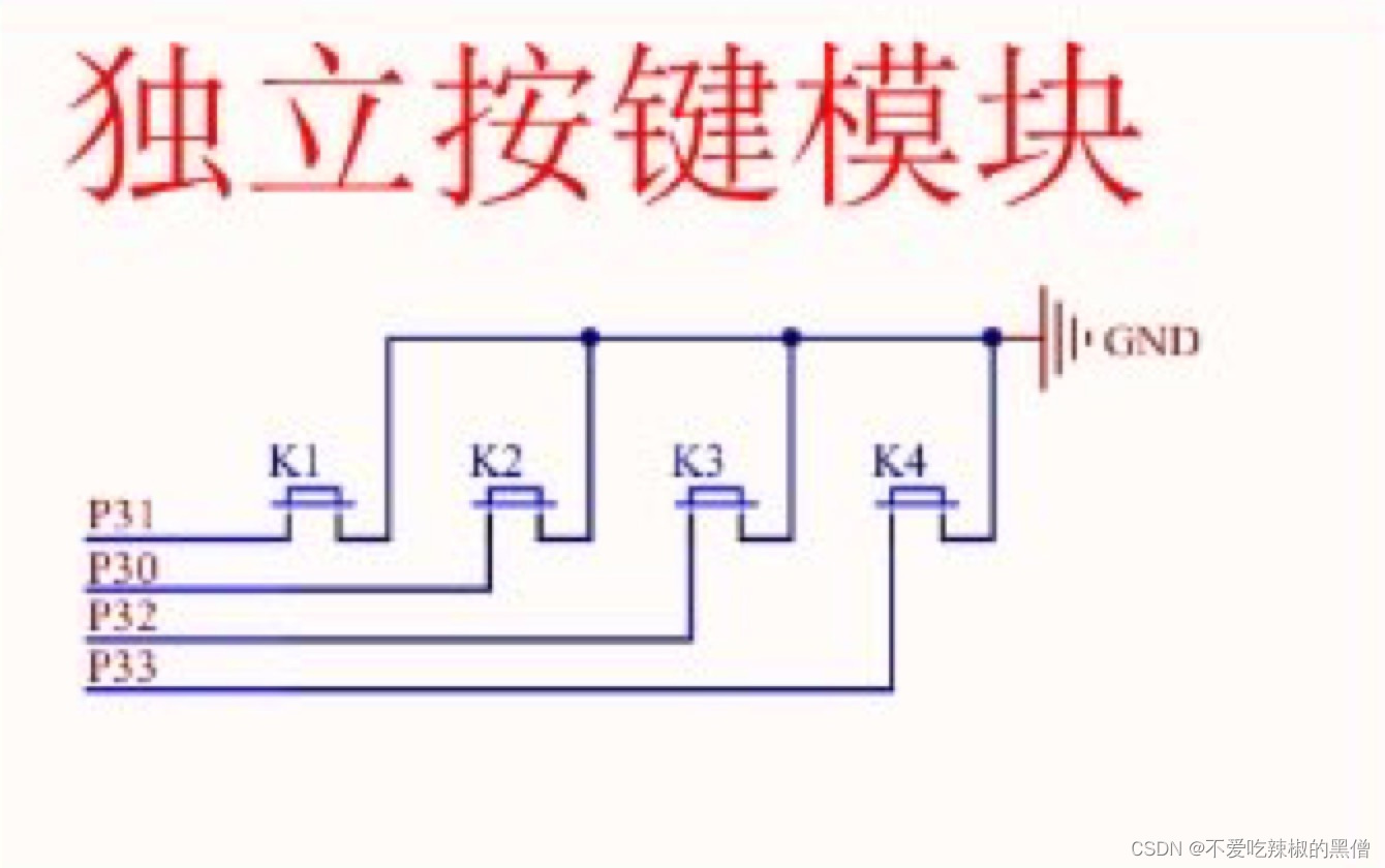 K1、K2、K3、K4一公共端接GND,另一端分别接单片机I/O口的P3^0到P3^3,因为单片机4组I/O口P0—P3都是高电平有效,当按键按下时,将I/O口拉到低电平使按键有效。
