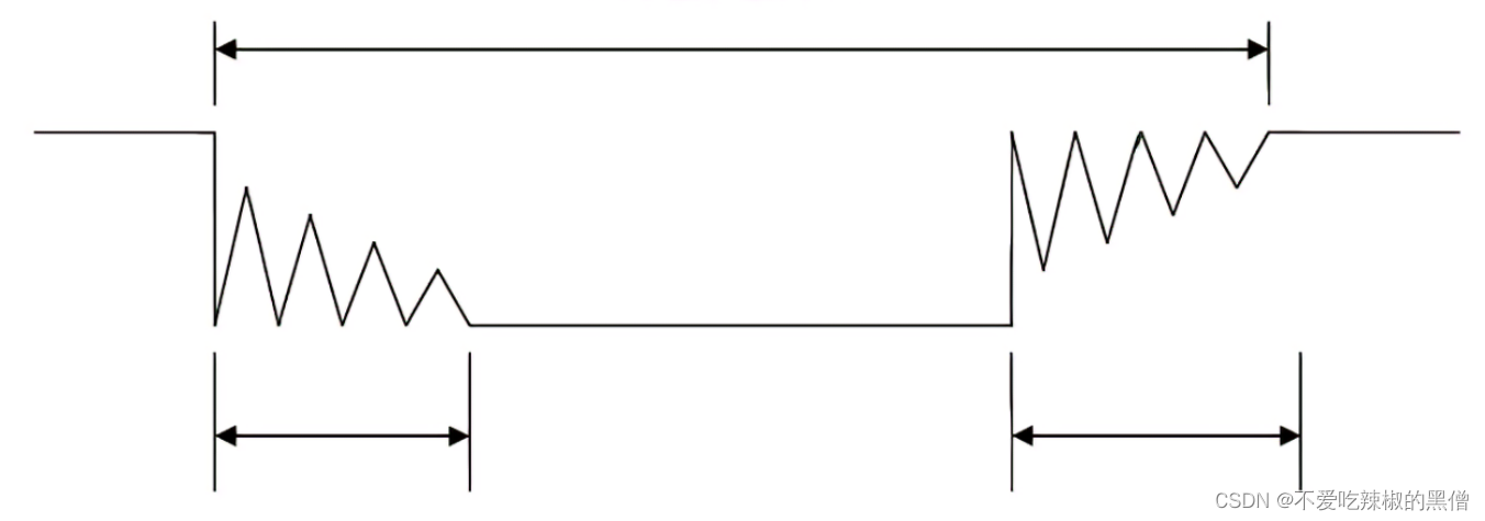 当没有按键按下时,电平为高电平,按下时,为0(由于机械触电,会弹逐渐稳定为0),机械开关抖动时间为5—10ms(不同开关时间不同),经过手松开的时间,若松开按键,经过5—10ms时间会逐渐回高电平。