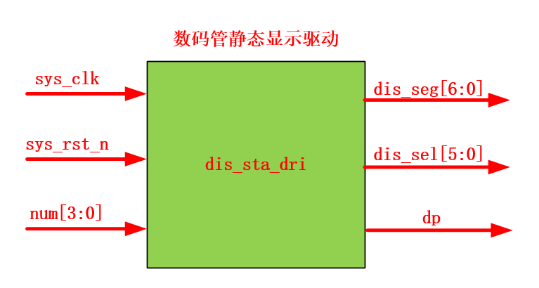 - dis_seg[6:0]:数码管7位段选,从高到底分别控制二极管a~g,低电平有效