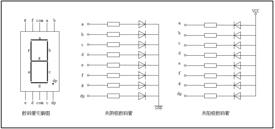 在上图中,我们可以看到数码管是由7根长条形发光二极管(a~g),1个点型发光二极管dp(表示小数点)组成。这8个发光二极管的连接方式有两种:共阴极和共阳极: